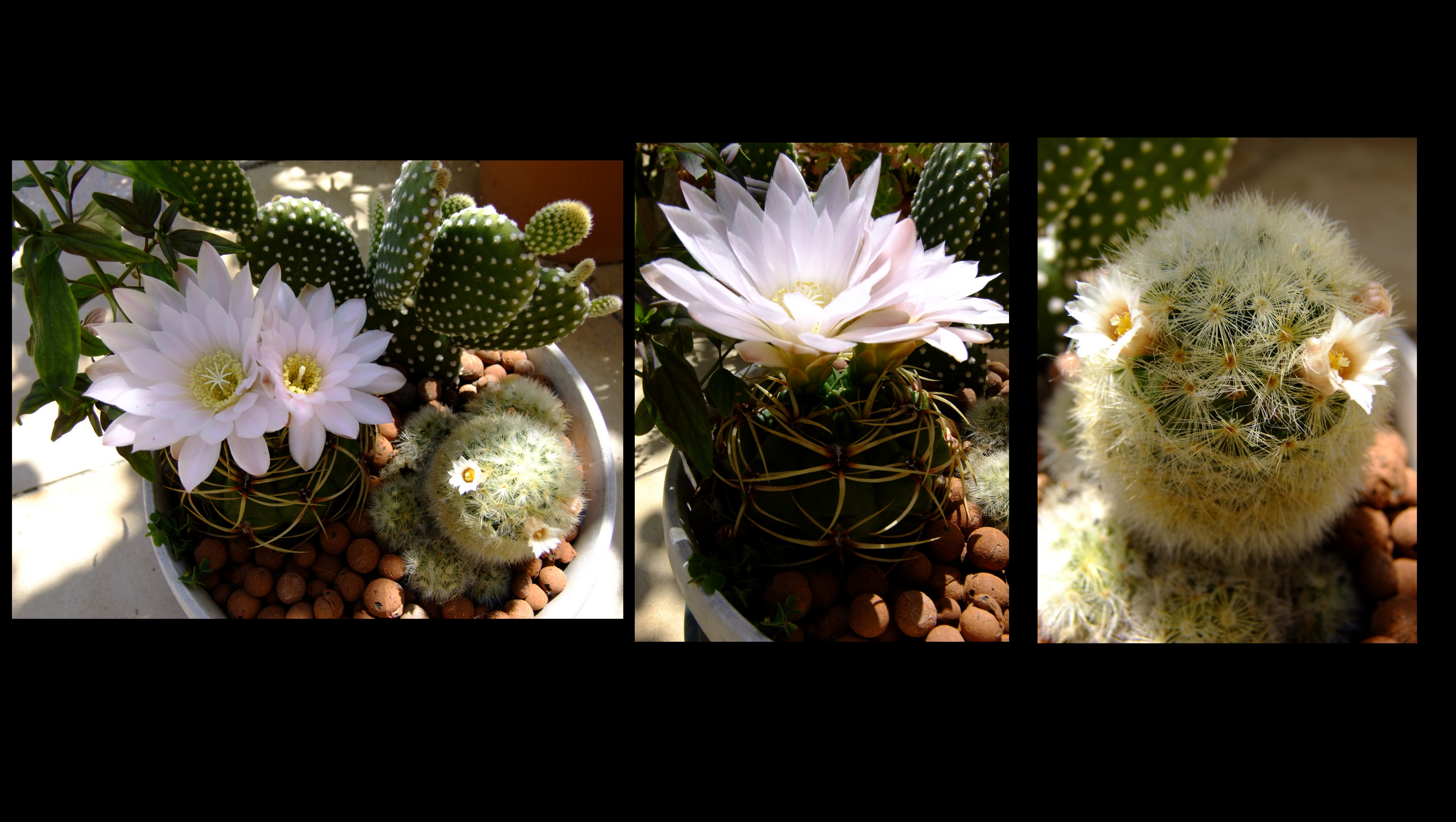 Eternel recommencement, la nature suit son cours. Malgré un printemps tardif, les cactus n’ont pas attendu l’arrivée pleine et entière du soleil pour fleurir et s’épanouir. Pousses multiples pour l’un, fleurettes pour d’autres, pleines fleurs rose pale pour celui qui ne se laisse toucher, même pas approcher. Fleurs en corolle font apparaître un visage …