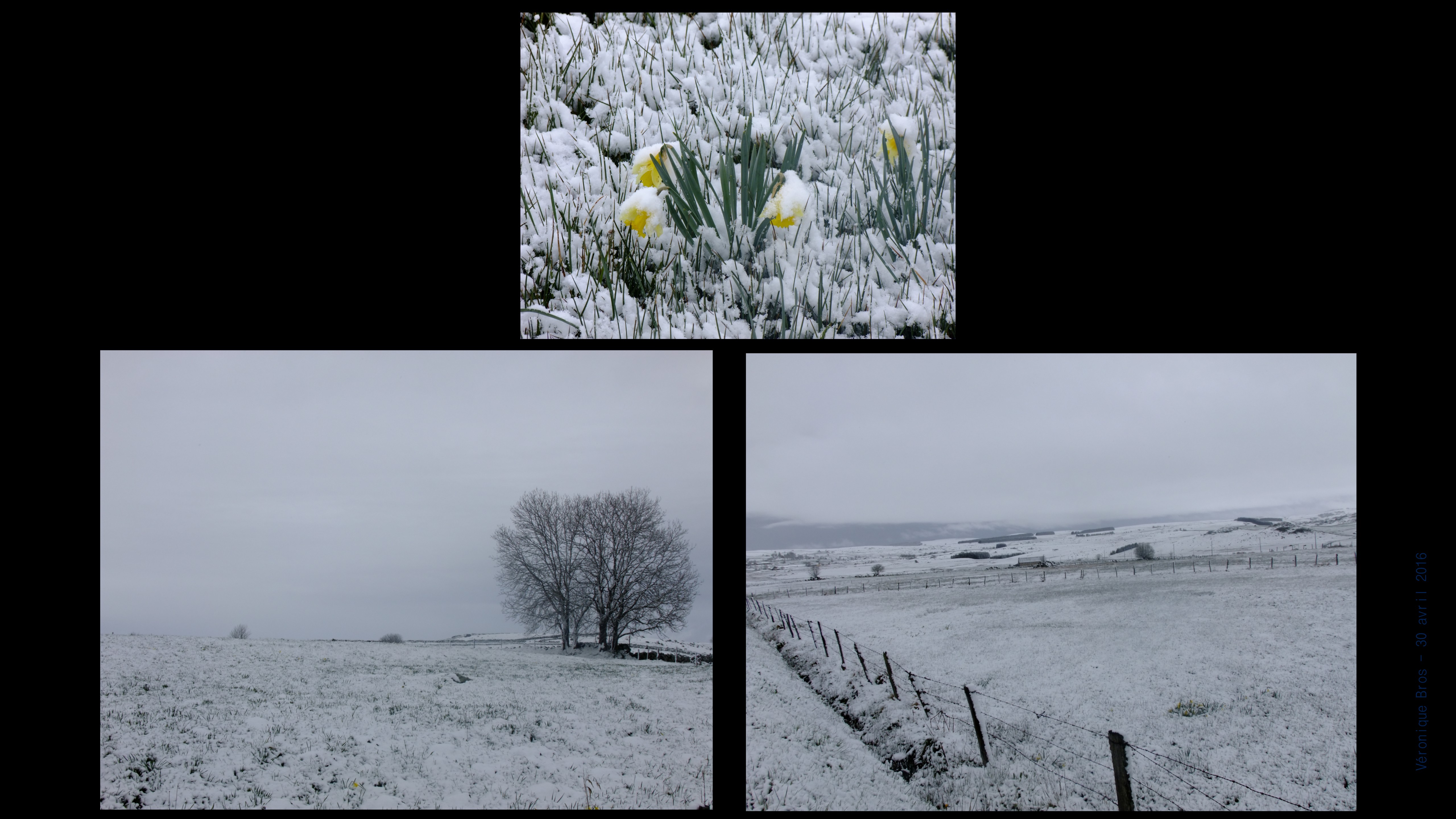 VP1_3721Le lendemain la neige. Epaisse et lourde. Flocons énormes. Ciel bas bouché. Air froid. Les perles jaunes affleurent encore sur les seins blanchis d’une laitance éphémère et glacée. Le paysage est métamorphosé. Plus beau encore. Plus sauvage encore. Plus austère encore.